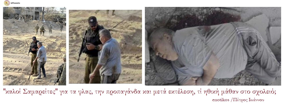Σύμφωνα με την καταγγελία και σε φωτογραφία που ανάρτησε ο ισραηλινός στρατός ως απόδειξη της ανθρωπιστικής βοήθειας προς τους άμαχους στη Λωρίδα της Γάζας, ένας στρατιώτης φαίνεται να βοηθά έναν ταλαιπωρημένο, ηλικιωμένο Παλαιστίνιο να απομακρυνθεί από το πεδίο της μάχης με τη Χαμάς, και να γλιτώσει από τα διασταυρούμενο πυρά.