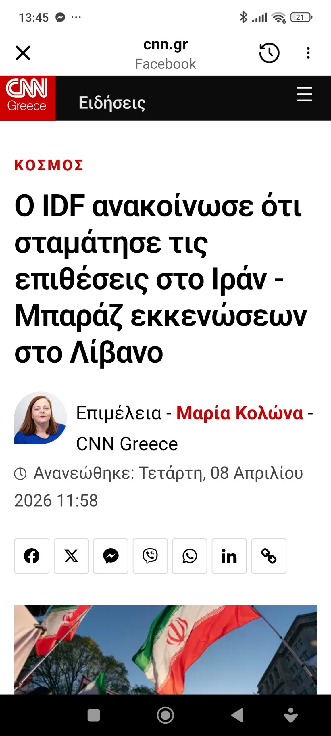 Eυρώπη / ΔιεθνήΑχνοφαίνεται ειρήνη; Πέτρος Ιωάννου1 εβδομάδα ago1 εβδομάδα ago01 mins 8/4/2026 https://www.cnn.gr/kosmos/liveblog/527784/ekexeria-ipa-kai-iran-gia-dyo-evdomades-gia-oloklirotiki-niki-kanei-logo-o-tramp?fbclid=IwdGRjcARDEOtjbGNrBEMQ3GV4dG4DYWVtAjExAHNydGMGYXBwX2lkDDM1MDY4NTUzMTcyOAABHtKxeEWIzRjv4XaIKrh3PqhSYRHmN6EkD4nnx7wimegIONSTkBBRkEe9Ah0J_aem_0h_LtRUkoO2AzFFHRIGe2g Πλοήγηση άρθρων Previous: η καλημέρα του ΑρκάNext: ΕΡΧΕΤΑΙ…ΜΕ ΝΕΑ – ΕΝΤΕΛΩΣ ΝΕΑ – ΕΓΓΡΑΦΑ ΤΟΥ ΧΕΝΡΙ ΚΙΣΙΝΓΚΕΡ Αφήστε μια απάντηση Ακύρωση απάντησηςΗ ηλ. διεύθυνση σας δεν δημοσιεύεται. Τα υποχρεωτικά πεδία σημειώνονται με *Σχόλιο * Όνομα * Email * Ιστότοπος Αποθήκευσε το όνομά μου, email, και τον ιστότοπο μου σε αυτόν τον πλοηγό για την επόμενη φορά που θα σχολιάσω.