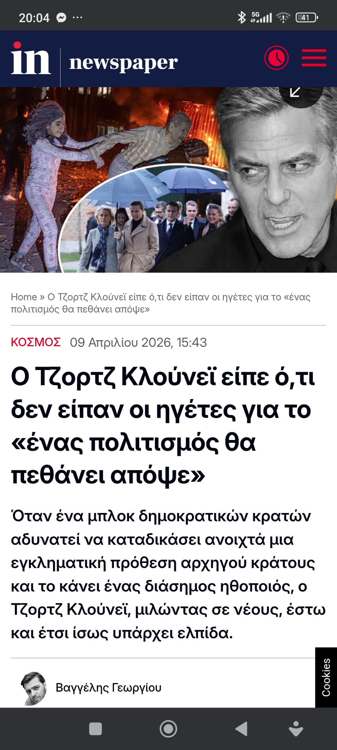 Eυρώπη / ΔιεθνήΌσα δεν τόλμησαν να πουν οι αρμόδιοι Πέτρος Ιωάννου5 ημέρες ago5 ημέρες ago01 mins Ο Τζορτζ Κλούνεϊ είπε ό,τι δεν είπαν οι ηγέτες για το «ένας πολιτισμός θα πεθάνει απόψε» Πλοήγηση άρθρων Previous: Πόσα μπορούν να συμβούν σε μία εβδομάδαNext: Βαθιά νοήματα Αφήστε μια απάντηση Ακύρωση απάντησηςΗ ηλ. διεύθυνση σας δεν δημοσιεύεται. Τα υποχρεωτικά πεδία σημειώνονται με *Σχόλιο * Όνομα * Email * Ιστότοπος Αποθήκευσε το όνομά μου, email, και τον ιστότοπο μου σε αυτόν τον πλοηγό για την επόμενη φορά που θα σχολιάσω.