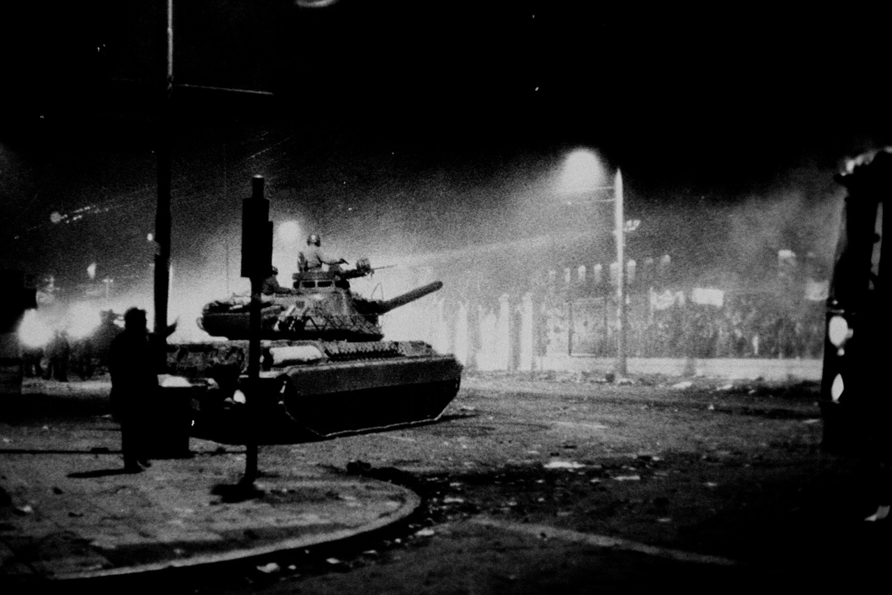 Ντραπήκαμε να φύγουμε, παίρναμε κάποιες προφυλάξεις και μείναμε προσπαθώντας να βοηθήσουμε, τραβώντας από την άσφαλτο τραυματισμένα παιδιά. Η νύχτα πήρε όψη εφιαλτική. Κοντά στα μεσάνυχτα, μέσα σε ανατριχιαστικό θόρυβο, πρόβαλαν από τη Λεωφόρο Αλεξάνδρας οι σκούρες φιγούρες των τανκς.