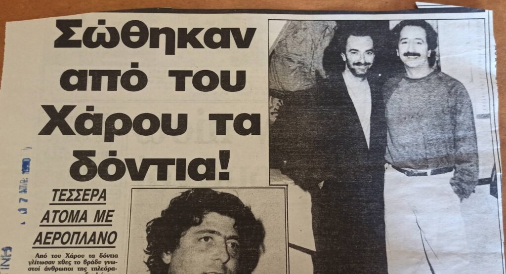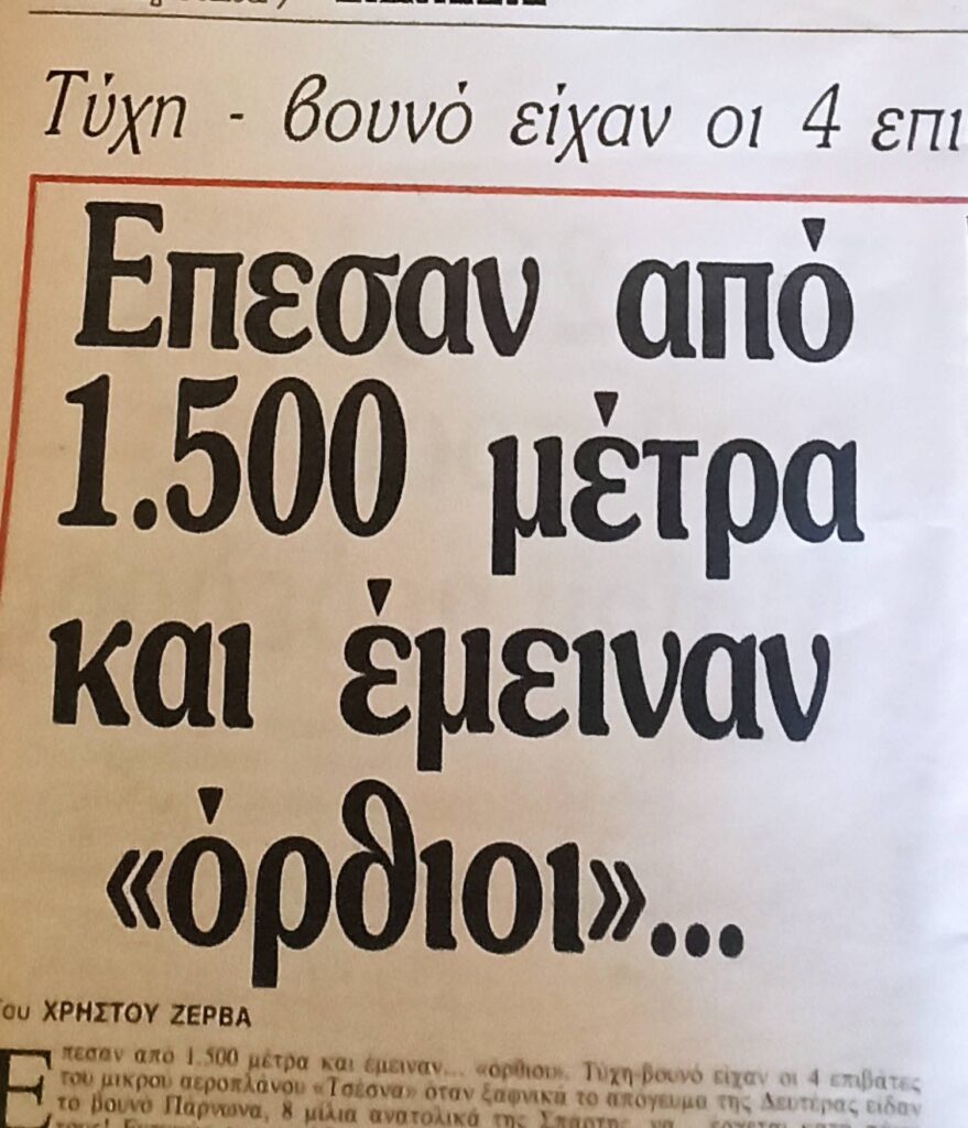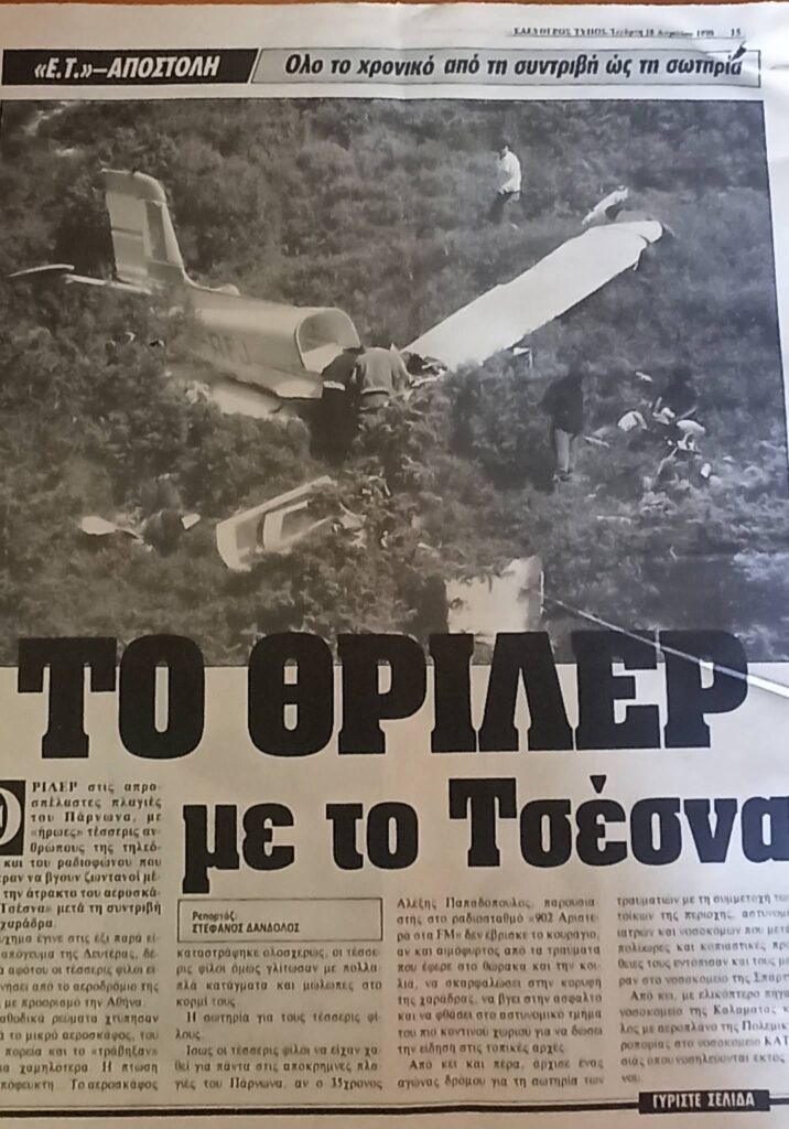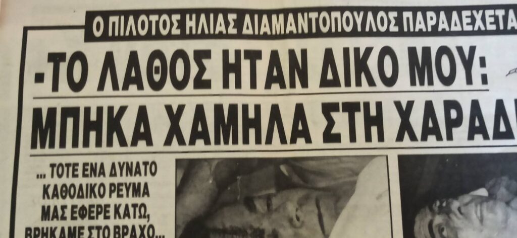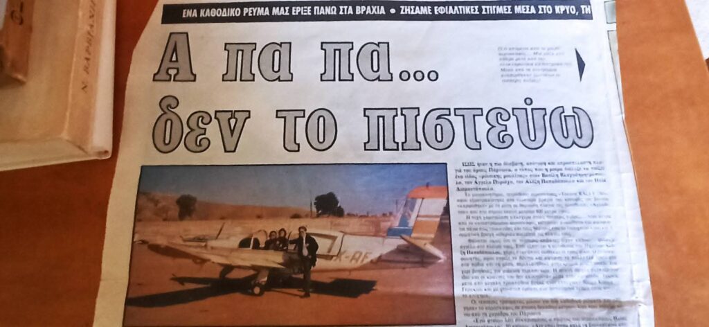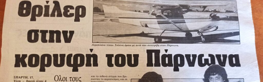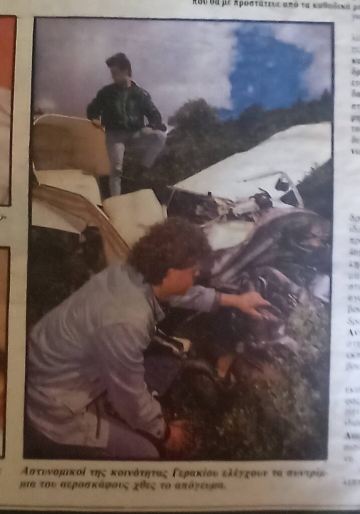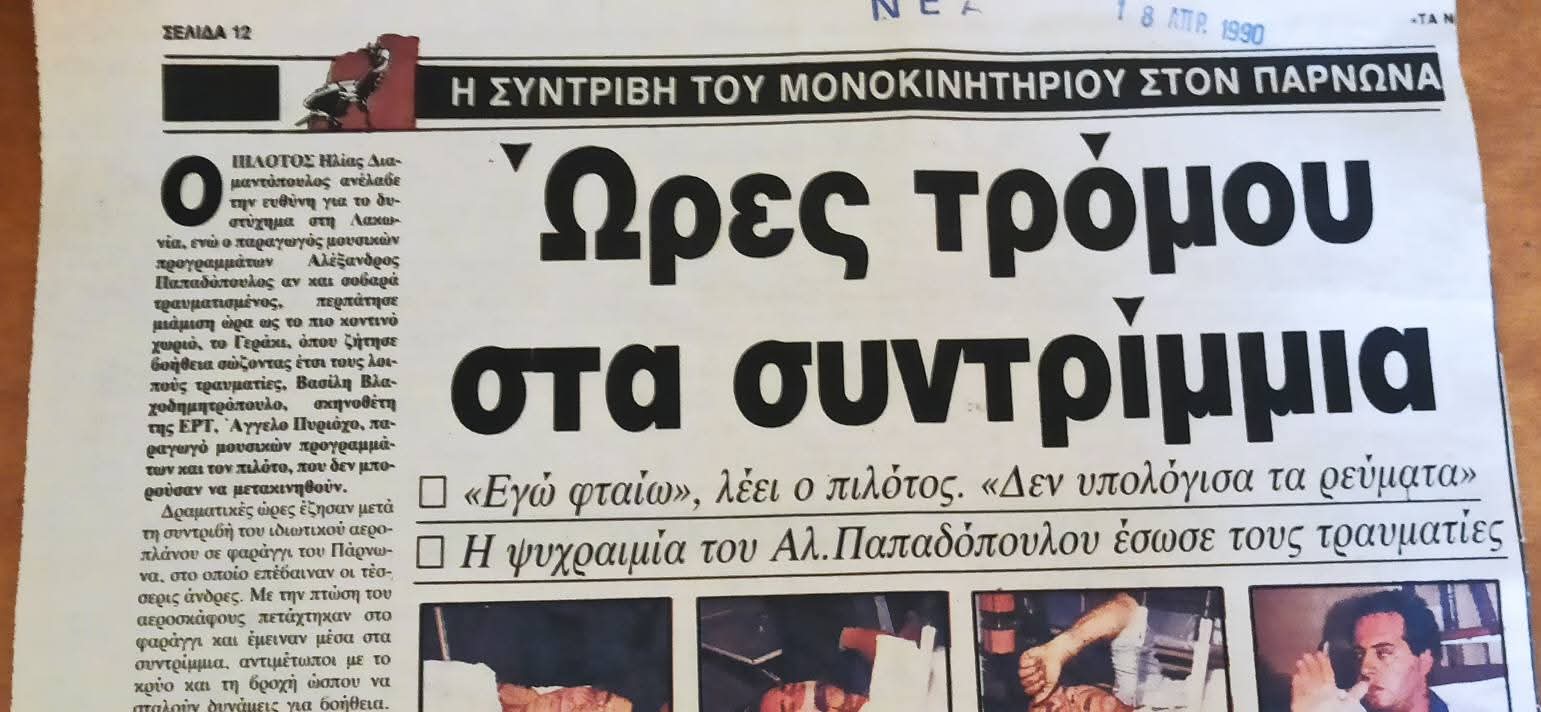 - Ήταν 17 Απριλίου 1990 , Δευτέρα του Πάσχα , όταν ξαναγεννήθηκα μέσα στα συντρίμμια ενός τετραθέσιου αεροπλάνου. Στον Πάρνωνα. Ψάχνοντας να βρω κάτι στο σπίτι της Αθήνας έπεσα σε ένα φάκελο με αποκόμματα εφημερίδων με θέμα το ατύχημα. Δε γνώριζα την ύπαρξη τους. Μάλλον τα κρατούσε η μάνα μου μαζί με πάρα πολλές ευχετήριες κάρτες.