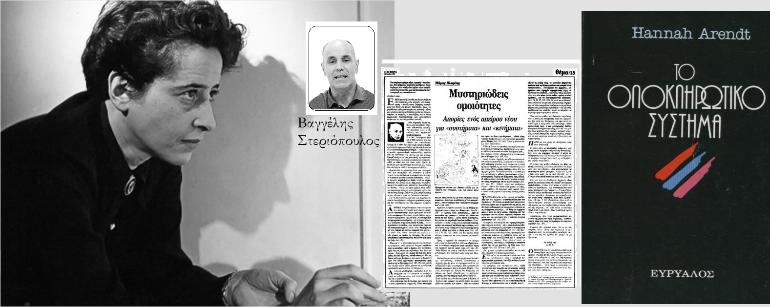Αρκετά από τα χαρακτηριστικά των «συστημάτων» που επισημαίνει και ανατέμνει η Χάννα Άρεντ, τα συναντάμε και σε κόμματα που λειτουργούν μέσα σε κοινοβουλευτικά καθεστώτα — κόμματα όχι μόνο ακροδεξιά και δεξιά, αλλά και «προοδευτικά». Και αναρωτιέμαι: πώς μπορεί να συμβαίνει αυτό το απίθανο και απίστευτο; Και απάντηση δεν βρίσκω… Εσείς, που έχετε γράψει πάρα πολλά και φαρμακερά τόσο για τις δικτατορίες «μας» όσο και για τους Χίτλερ, Στάλιν και Σία, μπορείτε μήπως να μου εξηγήσετε αυτή την (τέταρτη) σύμπτωση;