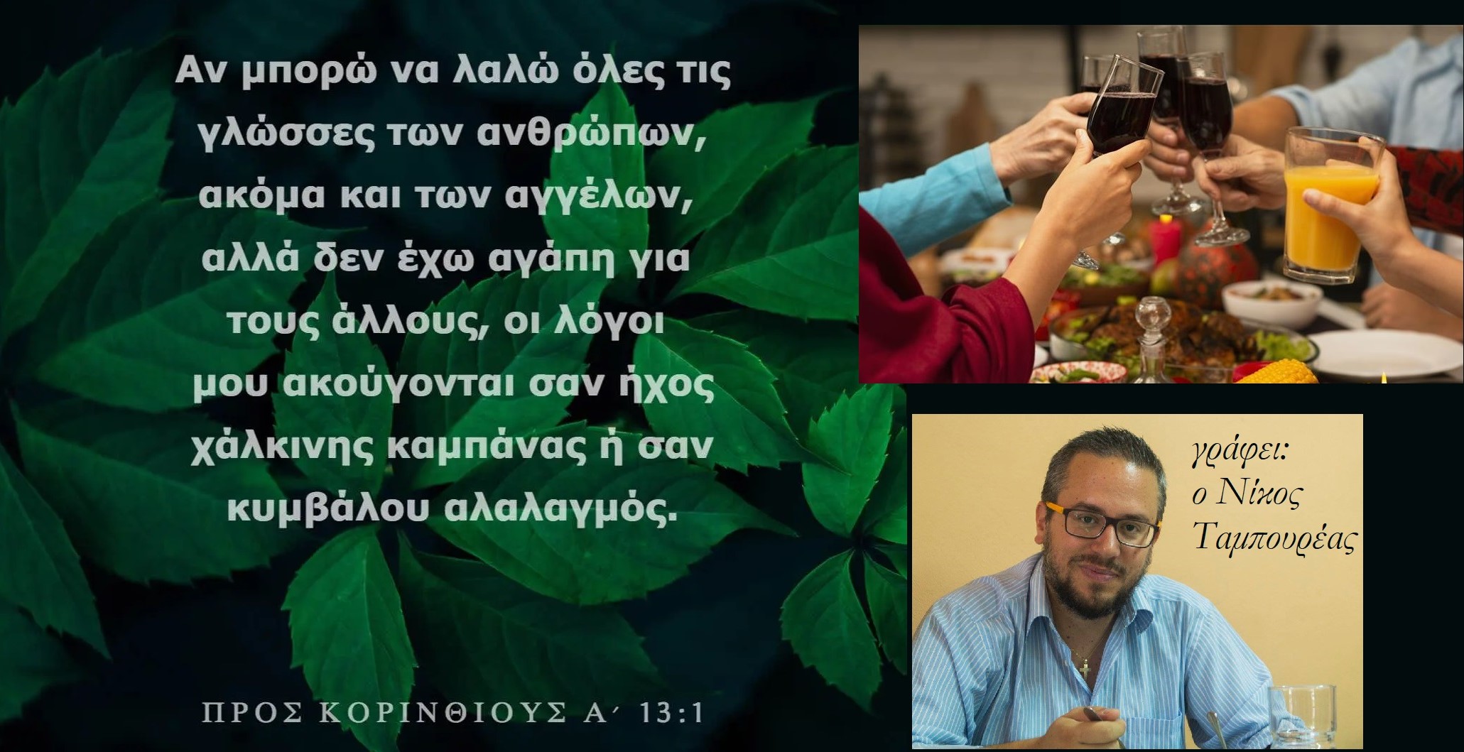 Για το τέλος της αρθρογραφίας αυτής αφήνω τα συναισθήματα της Νεφέλης. Αφού απάντησα στο e-mail της παλιάς μου μαθήτριας, την παρακάλεσα να μου πει πώς ένιωσε στο γιορτινό αυτό τραπέζι των Χριστουγέννων. Μου είπε ότι τις εορταστικές αυτές ημέρες καταλαβαίνει καλύτερα τον Ύμνο της Αγάπης του Αποστόλου Παύλου, παραθέτοντάς μου τις πρώτες σειρές του: ’’Ἐὰν ταῖς γλώσσαις τῶν ἀνθρώπων λαλῶ καὶ τῶν ἀγγέλων, ἀγάπην δὲ μὴ ἔχω, γέγονα χαλκὸς ἠχῶν ἢ κύμβαλον ἀλαλάζον’’. Στην απάντηση της μαθήτριας, σκέφτομαι, αναμετρώνται δύο κόσμοι. Αυτός της σύγχρονης κοσμικής ευδαιμονίας που ξεχνάει τα σπλάχνα μιας πονεμένης κοινωνίας και ένας δεύτερος. Αυτός της αγαπητικής επανάστασης που τείνει να συναντάει τον κάθε άνθρωπο σαν να είναι ο ίδιος ο Θεός!