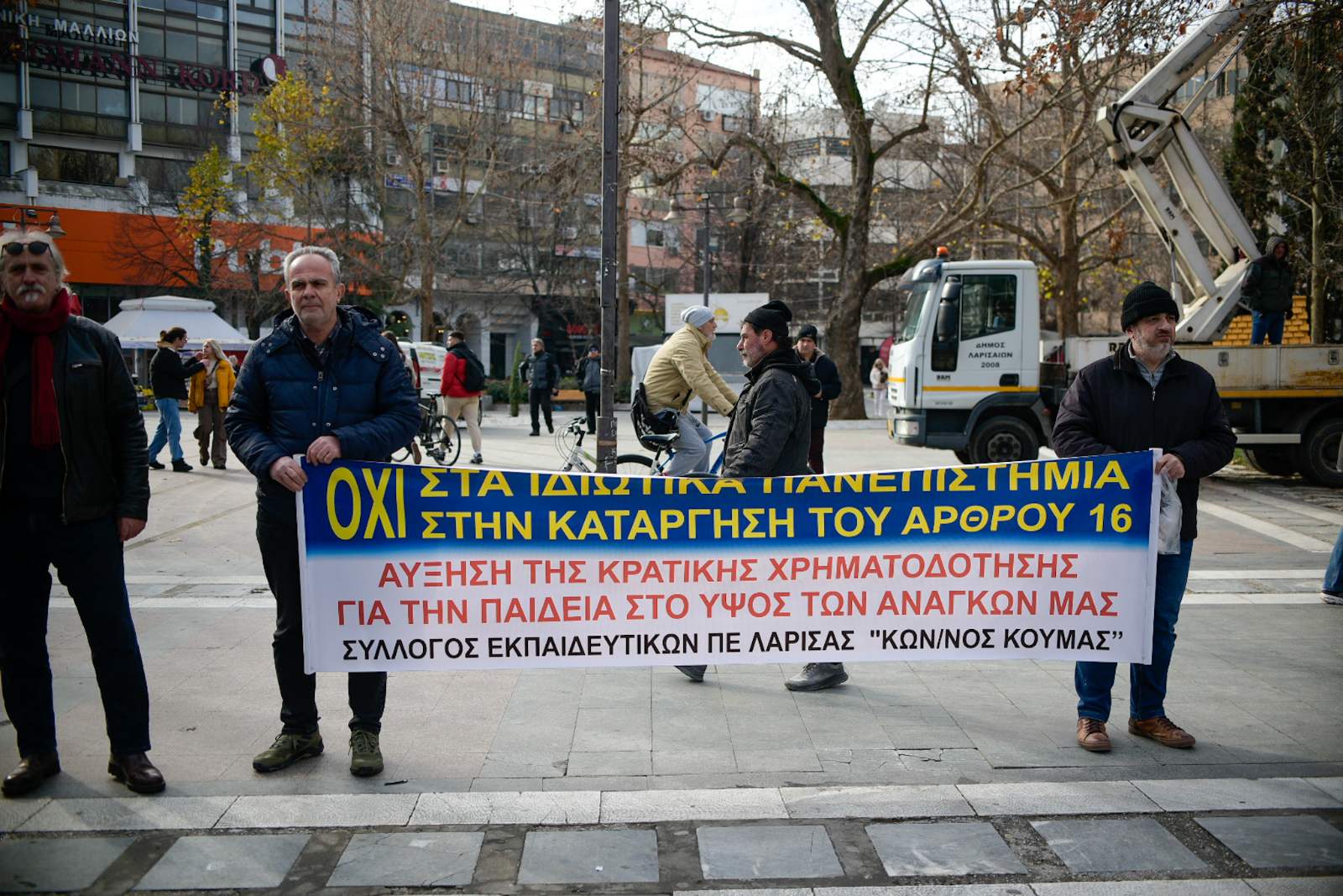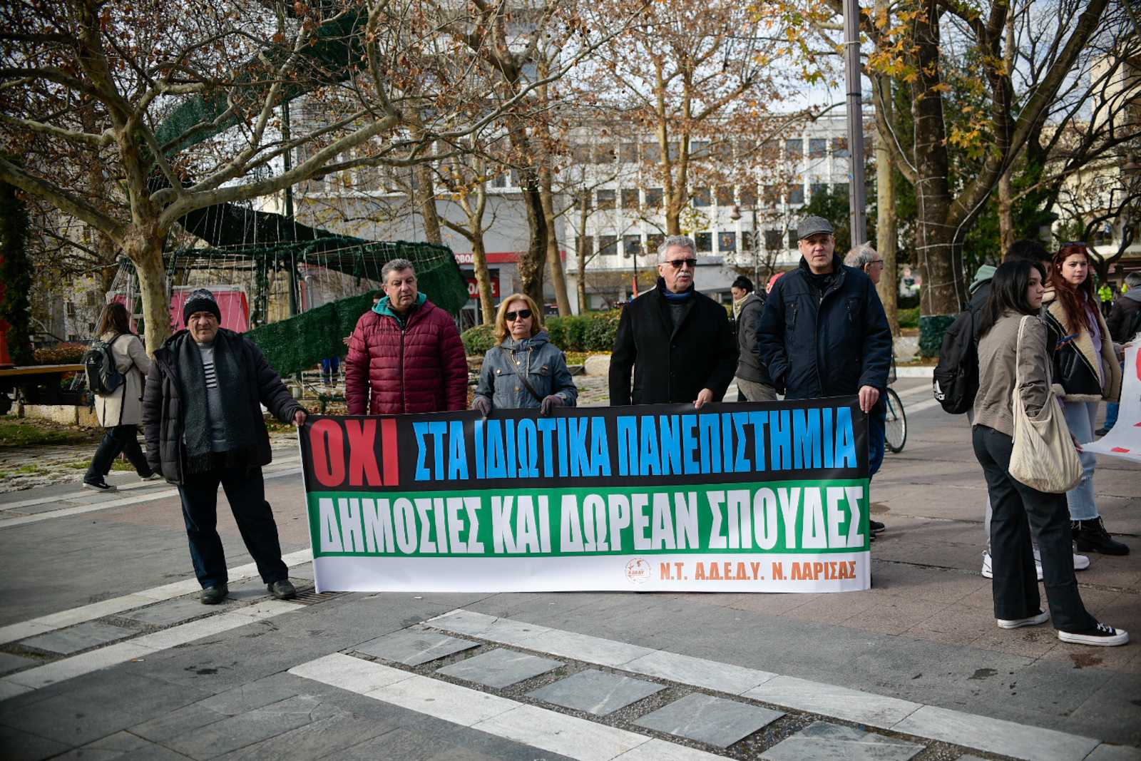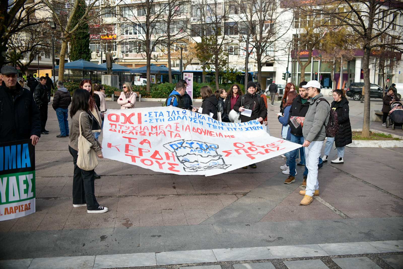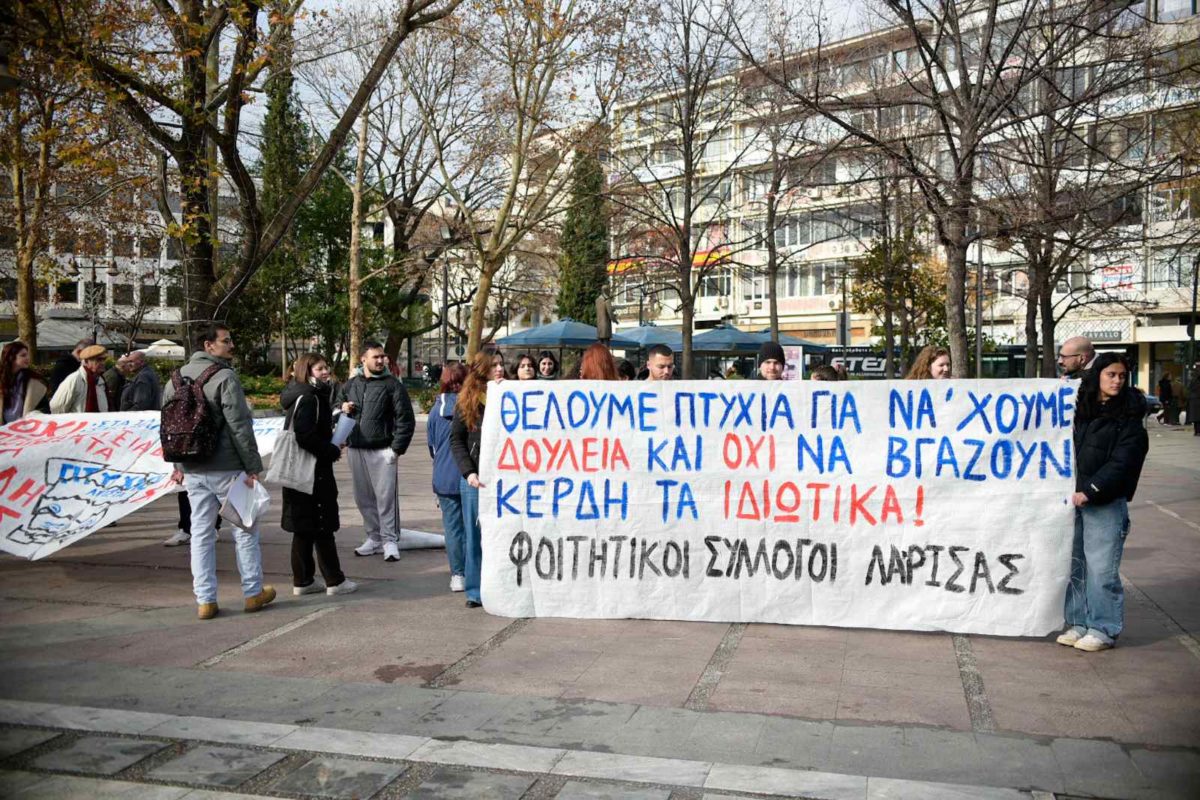 Ενάντια στο νέο νομοσχέδιο της κυβέρνησης που αφορά την ίδρυση των μη κρατικών Πανεπιστημίων διαμαρτυρήθηκαν σήμερα, το πρωί Πέμπτης, στην Κεντρική πλατεία της Λάρισας φοιτητικοί Σύλλογοι και άλλοι φορείς, κάνοντας λόγο για απαξίωση και υποβάθμιση της ποιότητας της εκπαίδευσης και των πτυχίων που θα παρέχονται από τα δημόσια ιδρύματα και καλώντας τον κόσμο να συστρατευθεί.