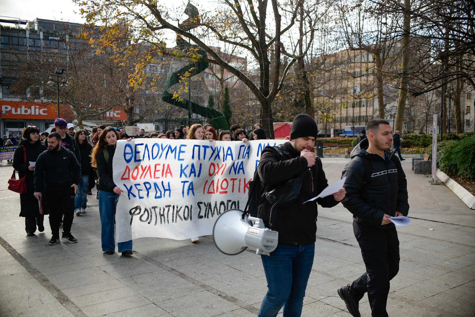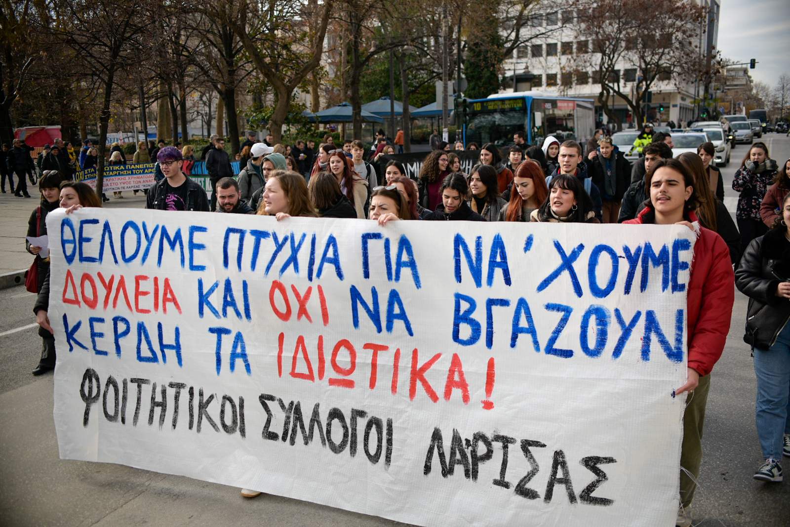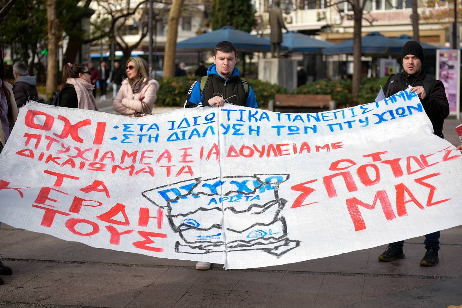«Βρισκόμαστε εδώ σήμερα μαζί με άλλους φοιτητικούς συλλόγους για να δώσουμε ένα ηχηρό μήνυμα στην κυβέρνηση και τα υπόλοιπα κόμματα, που θέλουν να δώσουν ένα πολύ γερό “χτύπημα” στις σπουδές και τα πτυχία μας. Εμείς φωνάζουμε δυνατά ότι δεν θα δεχτούμε, ούτε οι φοιτητές ούτε οι μαθητές, να υποβαθμίζουν τα πτυχία μας και να τσακίζουν τη μόρφωσή μας. Δεν δεχόμαστε η μόρφωσή μας να επιλέγεται με βάση ποιος φοιτητής έχει ή δεν έχει χρήματα για να σπουδάσει», τονίζουν οι φοιτητές.