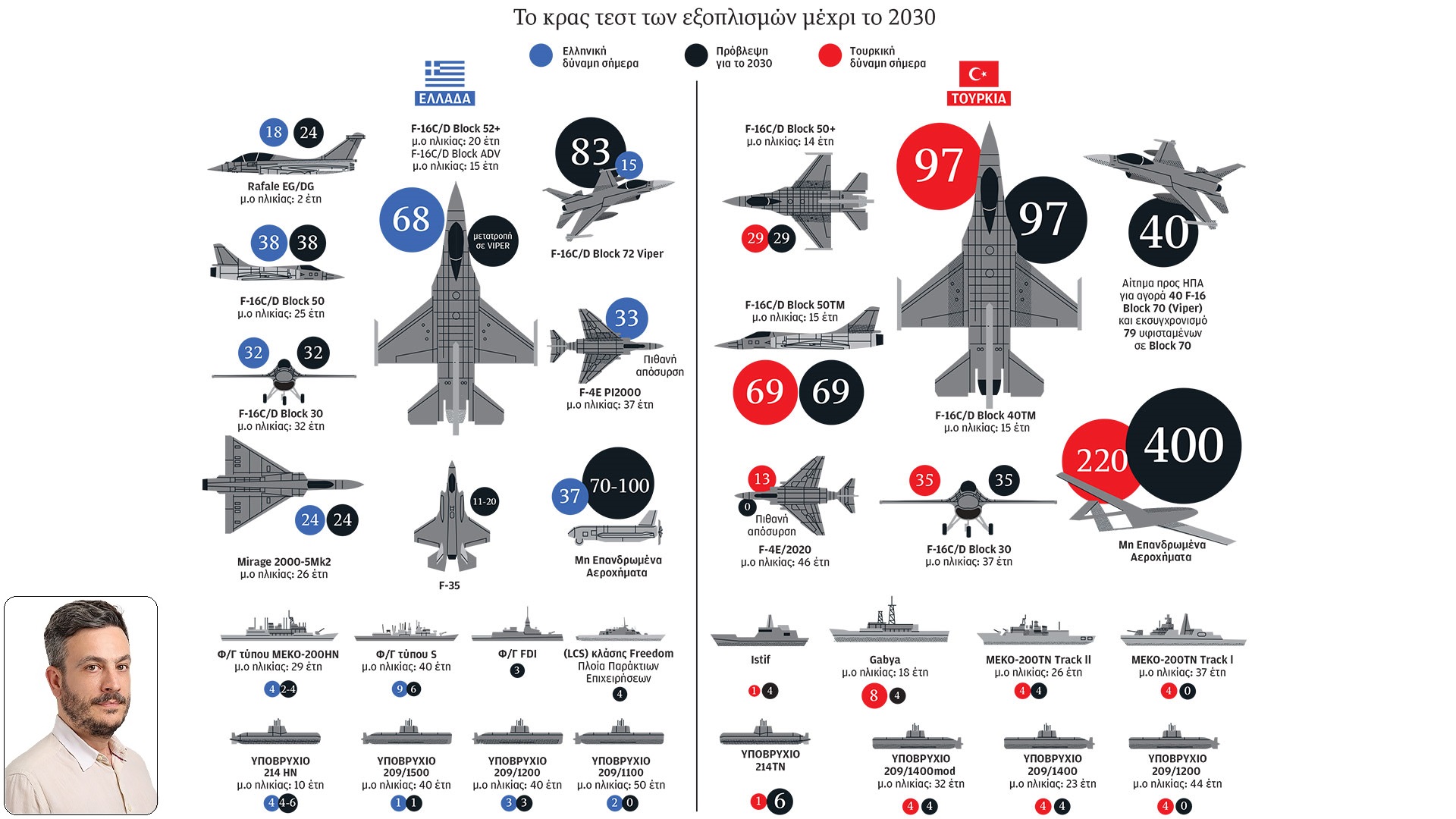 H «Κ» παρουσιάζει την ισορροπία δυνάμεων Ελλάδας και Τουρκίας σε ορισμένα βασικά οπλικά συστήματα (μαχητικά αεροσκάφη, φρεγάτες, υποβρύχια και μη επανδρωμένα αεροχήματα – UAV) σήμερα και την εικαζόμενη προβολή τους το 2030, έτος το οποίο και η σημερινή πολιτική ηγεσία του υπουργείου Εθνικής Αμυνας έχει θέσει ως όριο για την επίτευξη κάποιων μεσοπρόθεσμων στόχων ενίσχυσης των Ενόπλων Δυνάμεων.