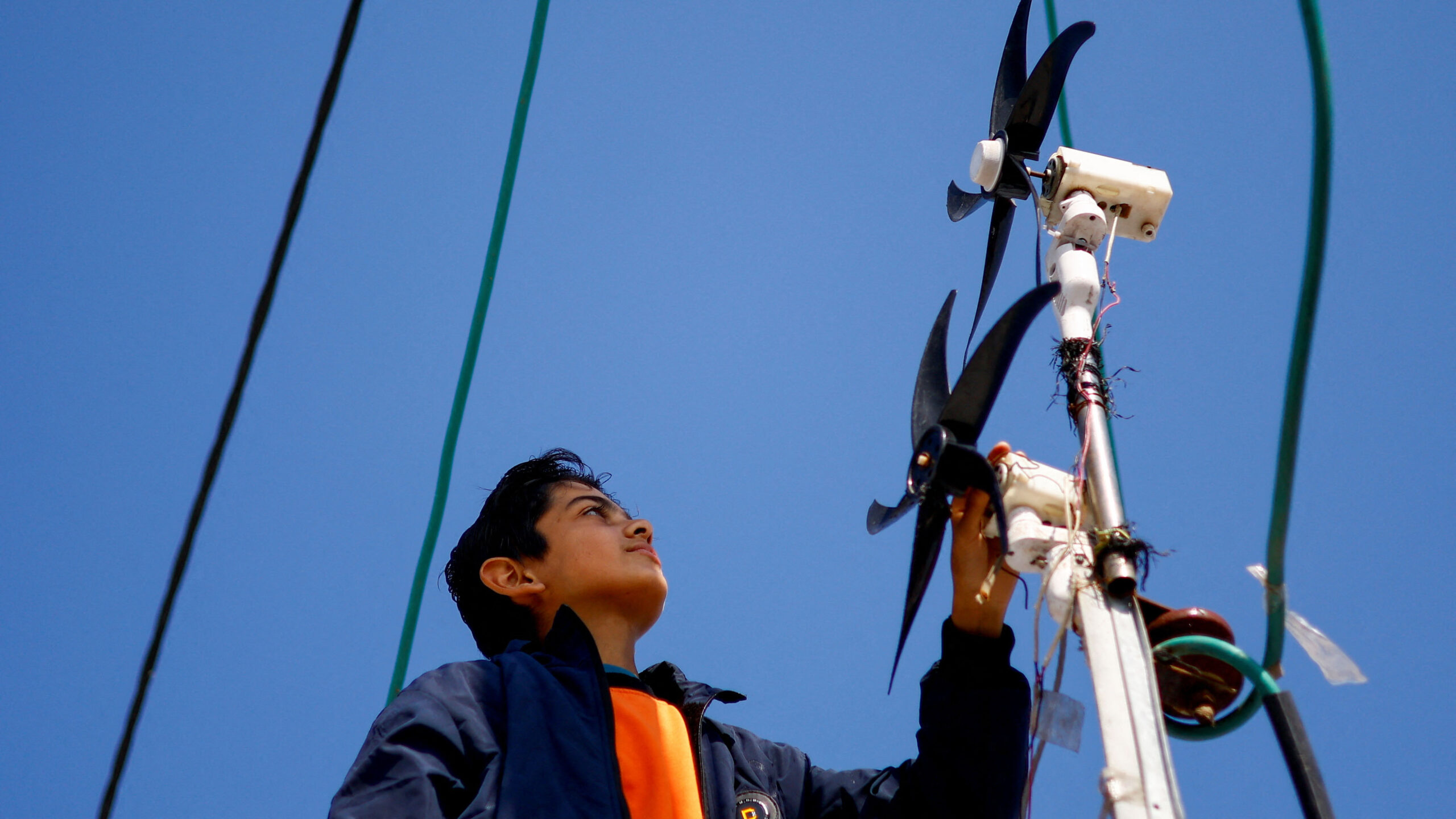 Με δύο ανεμιστήρες από τα παλιοσίδερα και λίγα καλώδια ο 15χρονος Χουσάμ Αλ-Ατάρ κατασκεύασε τη δική του πηγή παραγωγής ηλεκτρικού ρεύματος για να φωτίσει τη σκηνή όπου ζουν αυτός και η οικογένειά του κοντά στη Ράφα, αφού αναγκάστηκαν να εγκαταλείψουν το σπίτι τους λόγω του πολέμου στη Λωρίδα της Γάζας.