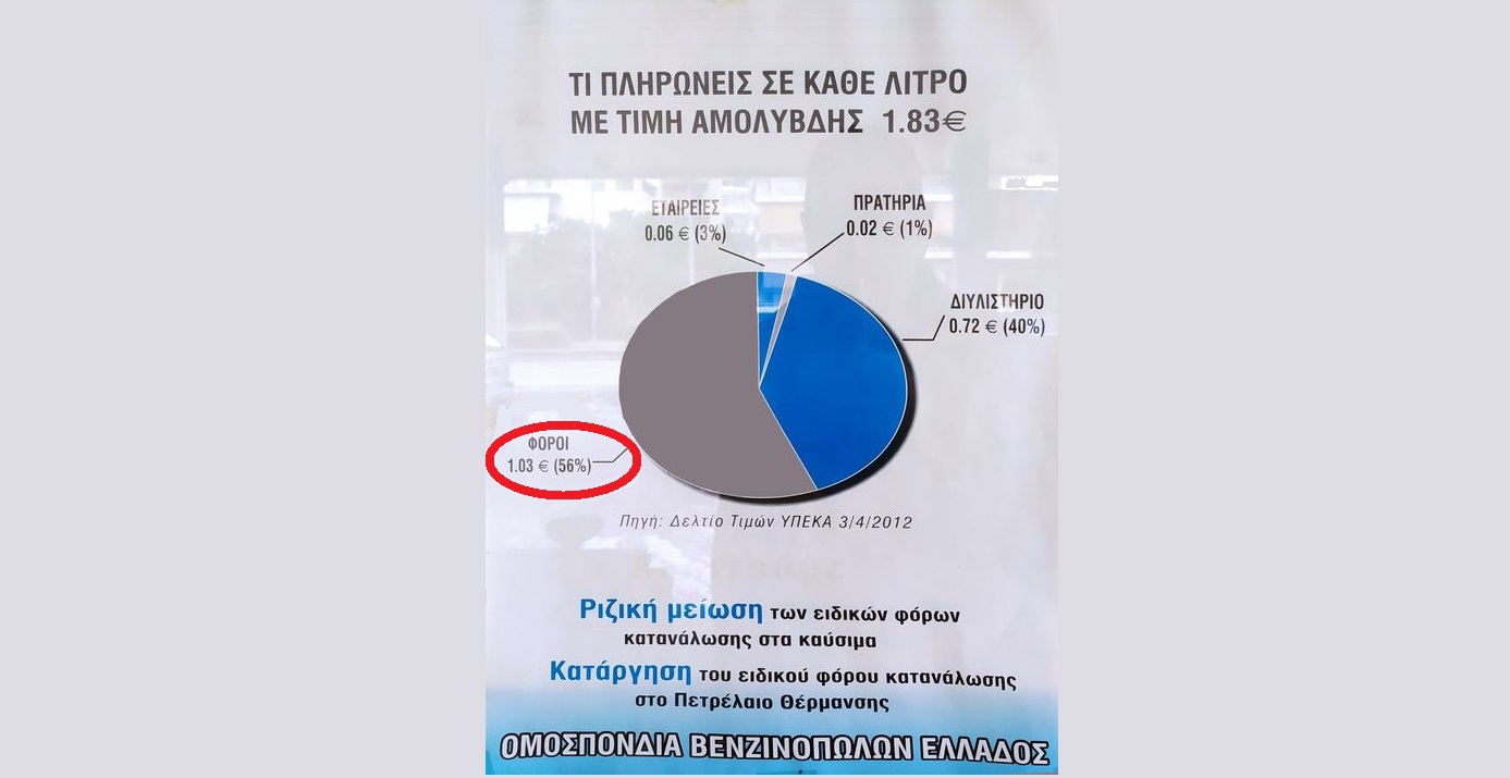 Σε κάθε πέρασμα από βενζινάδικο, το ”εθνικό” κράτος σε καταληστεύει. Με 56% φόρο, στάζουμε ένα λίτρο, 1 Ευρώ