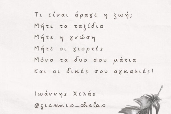 Πάτρα 22/6/2024 γράφει: η Ειρήνη Μουμούρη Θα πάει μακριά η βαλίτσα; με ρωτάς γιατί δεν αντέχεις άλλο να με κουβαλάς.Θα πάει μακριά η βαλίτσα; σε ρωτώ γιατί νιώθω ότι δίπλα σου, τα χρόνια μου, για χαμένα τα μετρώ. Καταντήσαμε να κουβαλάμε σαν βαλίτσες ο ένας τον άλλο.Τα χέρια μας δεν αγκαλιάζονται πια, μονο τα βάρη…