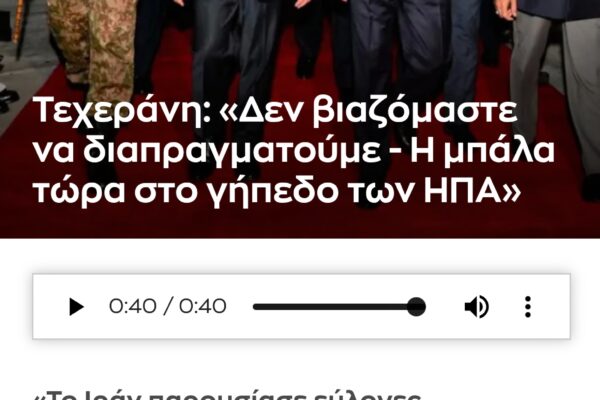 12/4/2026 Το Ιράν παρουσίασε εύλογες πρωτοβουλίες και προτάσεις στις διαπραγματεύσεις. Η μπάλα είναι στο γήπεδο της Αμερικής για να εξετάσει τα ζητήματα ρεαλιστικά https://www.skai.gr/news/world/iran-den-viazomaste-na-diapragmatoume-i-mpala-sto-gipedo-ton-ipa
