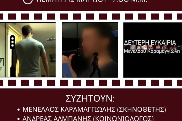 4/3/2026 Ο Σύλλογος “ΔΙΕΞΟΔΟΣ” για την Αντεγκληματική Πολιτική, τον Σωφρονισμό και την Επανένταξη σας καλεί στο Χατζηγιάνννειο Πνευματικό Κέντρο την Πέμπτη 12 Μαρτίου, στις 7.00 μ.μ. για να δούμε την εξαιρετική ταινία του Μενέλαου Καραμαγγιώλη “ΔΕΥΤΕΡΗ ΕΥΚΑΙΡΙΑ”. Μετά την προβολή της ταινίας θα ακολουθήσει σύντομη συζήτηση ανάμεσα στον σκηνοθέτη, τον Ανδρέα Αλμπάνη (κοινωνιολόγο), τον Γιώργο…